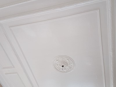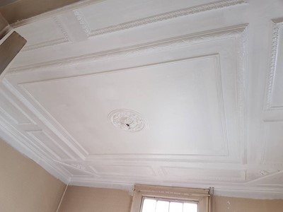 Een monumentaal plafond wat al 70 jaar niet meer geschilderd was voorzien van een nieuwe verflaag is geen eenvoudige klus. Na reparaties en drie lagen verf ziet het plafond er weer uit als nieuw, zonder dat de authentieke details verloren zijn gegaan.